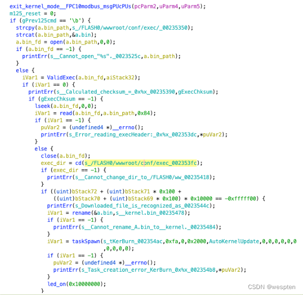 当检查到子功能码为6时,会检查指令是否为8,如果是的话即进行下面的操作:首先构造一个a.bin文件的目录的字符串,尝试open,成功则进行合法性校验,然后又开始读取该文件的header,失败则报错,接着尝试进入/FLASH0/wwwroot/conf/exec目录,成功后通过简单的检查确定文件是否为下载的内核bin,是的话进行改名,将a.bin改为新的kernel.bin,最后创建内核更新的任务,打开led灯。