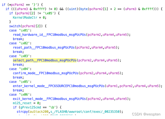 首先会检查拿到消息的function code是不是125,不是的话会把board_id设置为0x1,是的话会使用switch对code的[2]进行分发,也就是说[2]代表的是子功能码,可以看到内容包括读取硬件id、进入内核模式等等权限极高的操作,但是这还不算是太大的危害,真正可怕的是后面的内容。