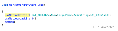 前三个函数都非常简单,分别是获取地址、掩码,usrNetDevNameGet函数用来获取网络设备名称。最后调用了usrNetworkDevStart来进行设备的启动。