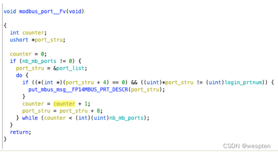 首先会检查nb_mb_port是否为0,这个变量代表的就是port的数量,不是的话则拿到端口的列表,循环,循环变量为用来计数的counter和port的结构体,循环内容是检查port_stru的第五项是否为0,并且第一项不能为login_prtnum(最开始为空,后面会变化),如果符合则以port的结构体为参数调用put_mbus_msg。
