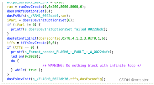 首先是各类的初始化,首先创建了ram设备,也就是我们上面说的块设备,然后在RAM1建立了文件系统,初始化相关设置。然后又建立了tffs设备,也就是flash设备,由于我们之后要从flash设备中读取运行程序、配置信息等重要文件(在后面会提到),一旦建立失败后果严重,所以失败了我们就直接死循环。