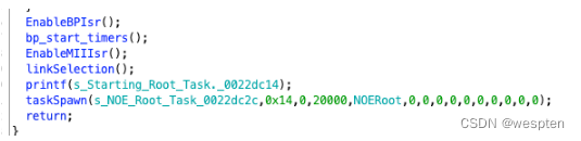 接着的几个函数也是用来做一些初始化工作的,当这些全部完成后,会打印”Starting Root Task.“,然后通过taskSpawn创建名为NOERoot新任务。