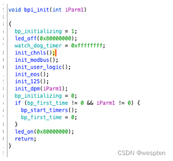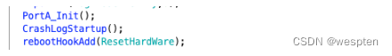 往下走PortA_Init用来初始化端口,CrashLogStartup则是对于log的设置,rebootHookAdd是我们之前提到过的hook操作,它将重启的操作进行hook,resetHardWare就是hook后的函数,其中也主要是一些设置操作。回到usrAppInit,接着调用的是bpi_init函数。