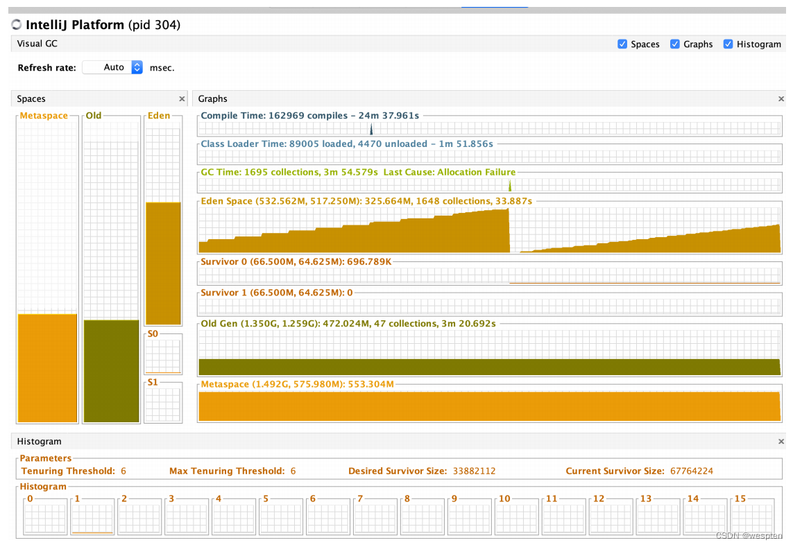 Visual GC 是常常使用的一个功能,需要通过插件按照,可以明显的看到年轻代、老年代的内存变化,以及gc频率、gc的时间等,感觉这个插件很酷!