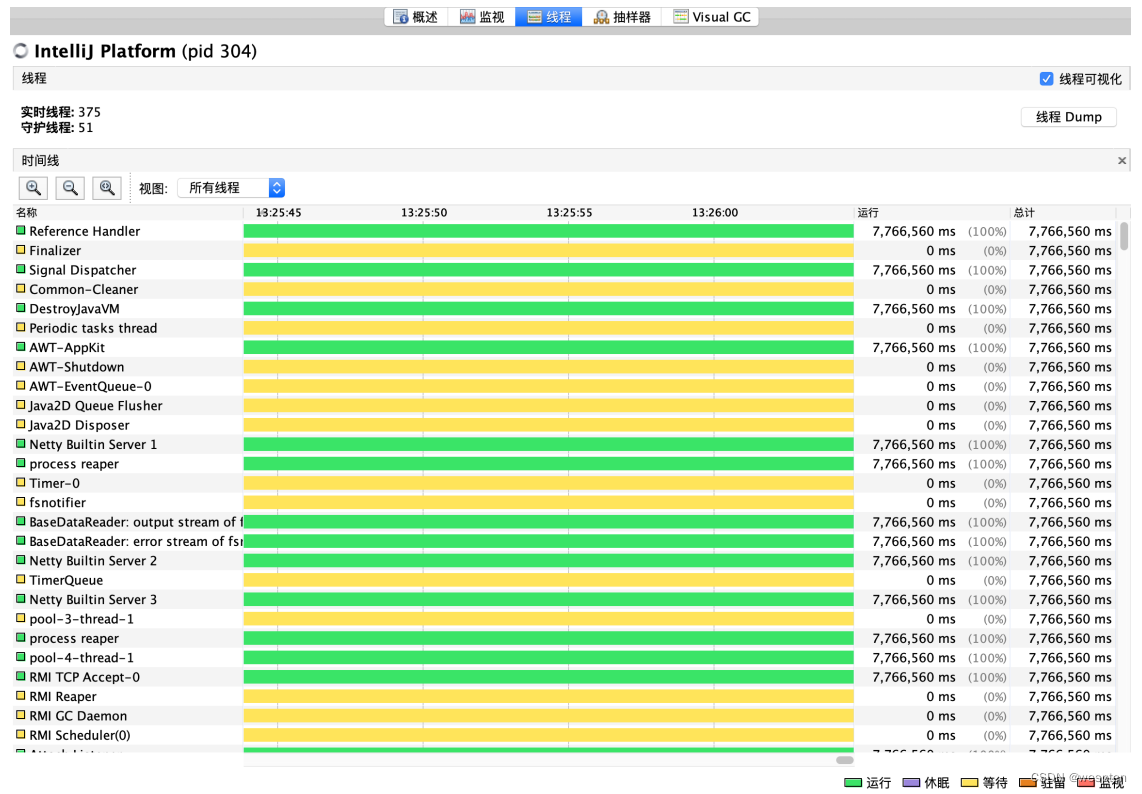 线程:相当于可视化的jstack命令,同时也可以点击“检测死锁”来检查线程之间是否有死锁的情况。