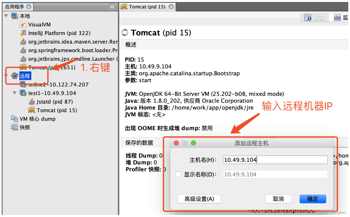 这个时候在VisualVM里面的远程连接上右键->添加远程主机,输入IP就可以看到Jstatd了。