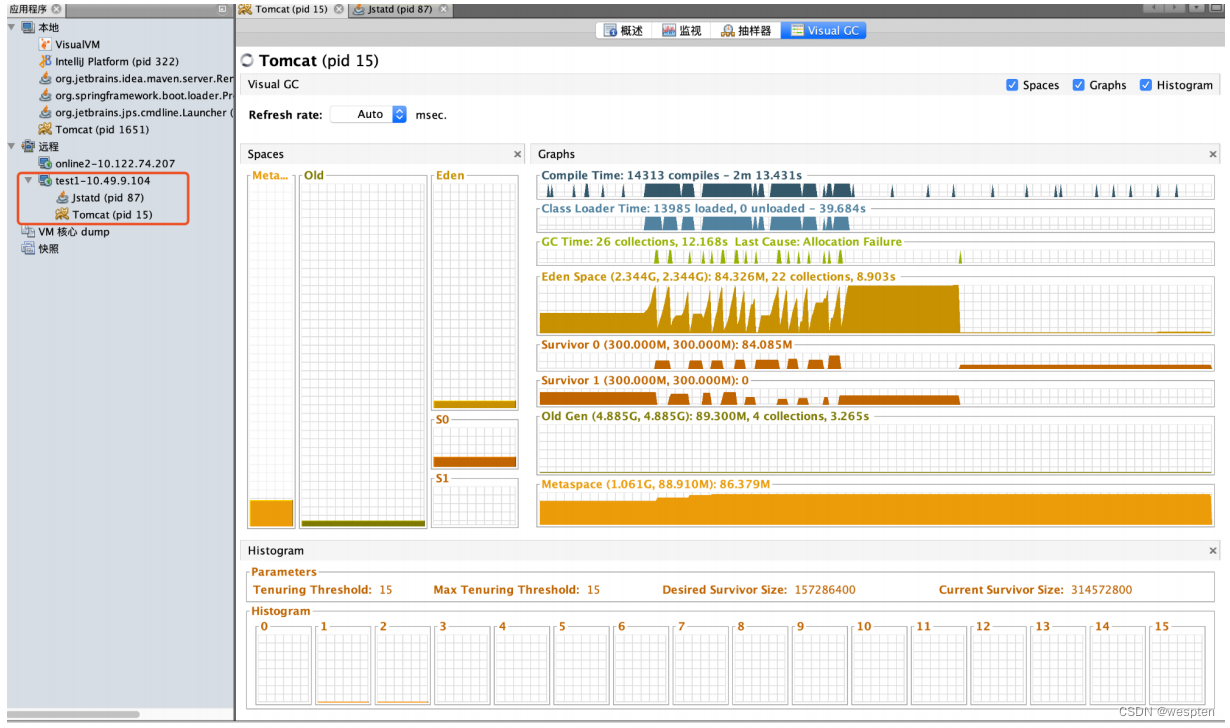 这个方式其实是按照网上的教程操作的,我操作的是公司远程测试环境的机器,但是我操作过程中,其实没有走“配置端口”这一步,也就是只操作了“通过jstatd启动RMI”,就可以通过该工具显示JVM视图,感觉和网上说的不一样。