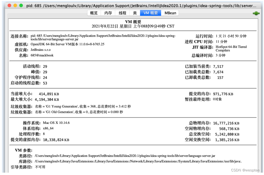 VM概要:展示JVM所有信息总览,包括基本信息、线程相关、堆相关、操作系统、VM参数等。