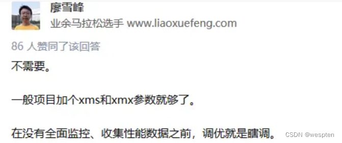 比较认可廖雪峰老师的观点,要认识到JVM调优不是常规手段,性能问题一般第一选择是优化程序,最后的选择才是进行JVM调优。