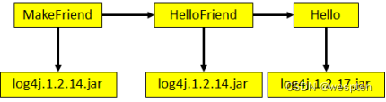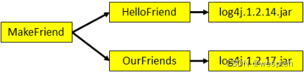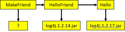 举个例子:我们现在有三个工程MakeFriend、HelloFriend和Hello。MakeFriend依赖HelloFriend,HelloFriend依赖Hello。而Hello依赖log4j.1.2.17.jar,HelloFriend依赖log4j.1.2.14.jar。