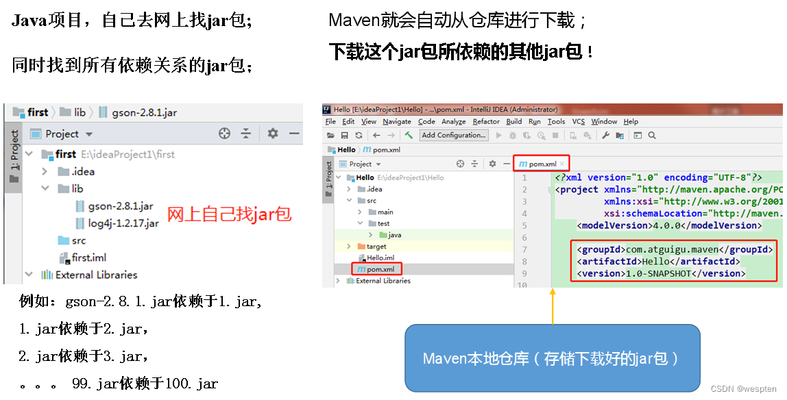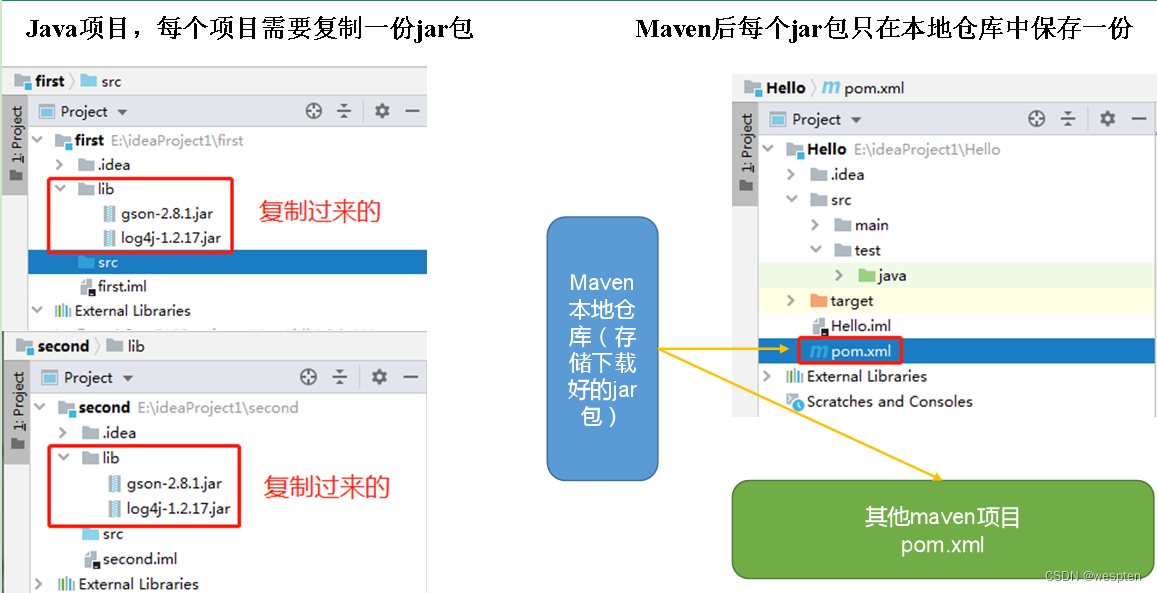 而使用Maven后每个jar包只在本地仓库中保存一份,需要jar包的工程只需要维护一个文本形式的jar包的引用——我们称之为“坐标”。不仅极大的节约了存储空间,更避免了重复文件太多而造成的混乱。