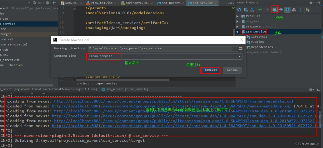 在 ssm_service 工程中添加以上配置后,添加 ssm_dao 工程的依赖,删除本地仓库中 ssm_dao