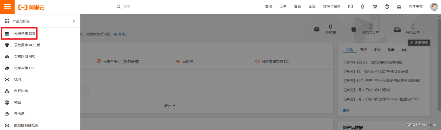 2)打开侧边栏,点击云服务器ECS