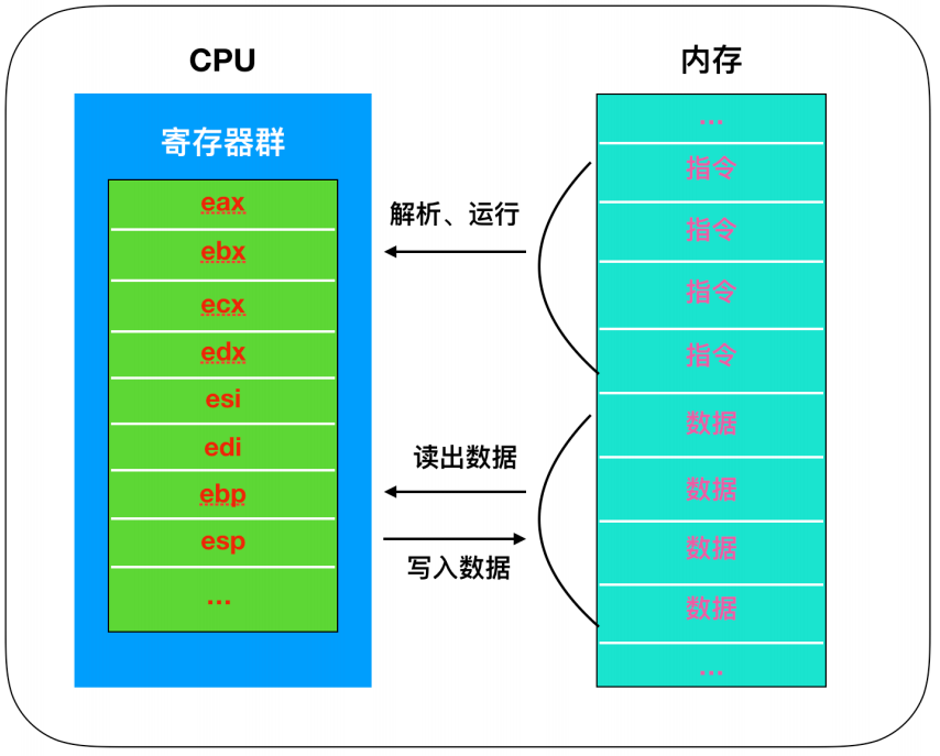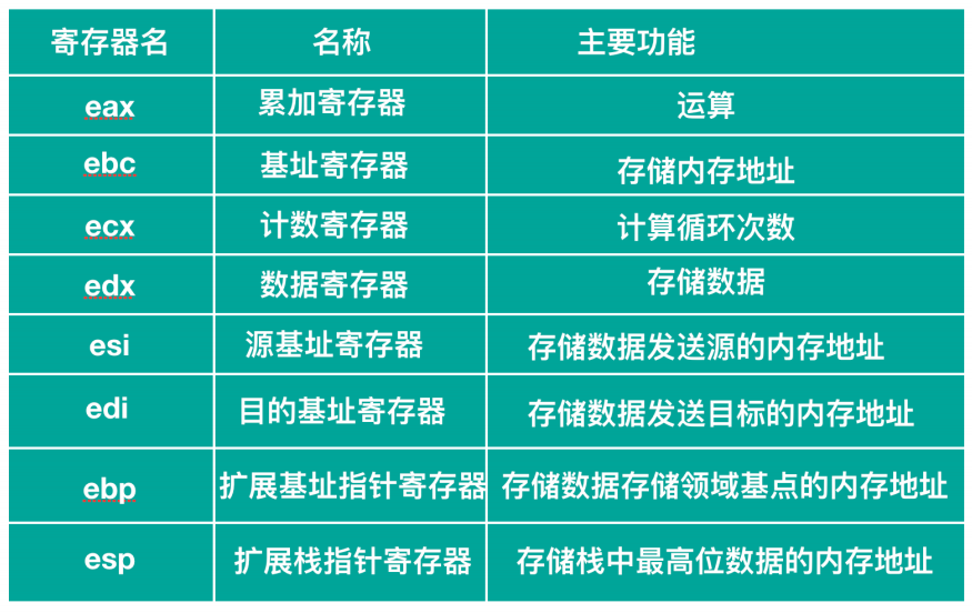 汇编语言能够帮助你理解计算机做了什么工作、机器语言级别的程序是通过寄存器来处理的,上面代码中的 eax,ebp 都是表示的寄存器,是CPU内部寄存器的名称,所以可以说 CPU是一系列寄存器的集合体。在内存中的存储通过地址编号来表示,而寄存器的种类则通过名字来区分。