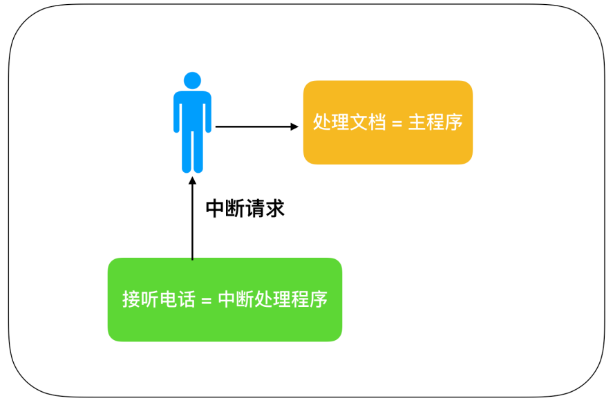 从中断处理开始到请求中断的程序(中断处理程序)运行结束之前,被中断的程序(主程序)的处理是停止的。这种情况就类似于在处理文档的过程中有电话打进来,电话就相当于是中断处理。假如没有中断处理的发生,就必须等到文档处理完成后才能够接听电话。