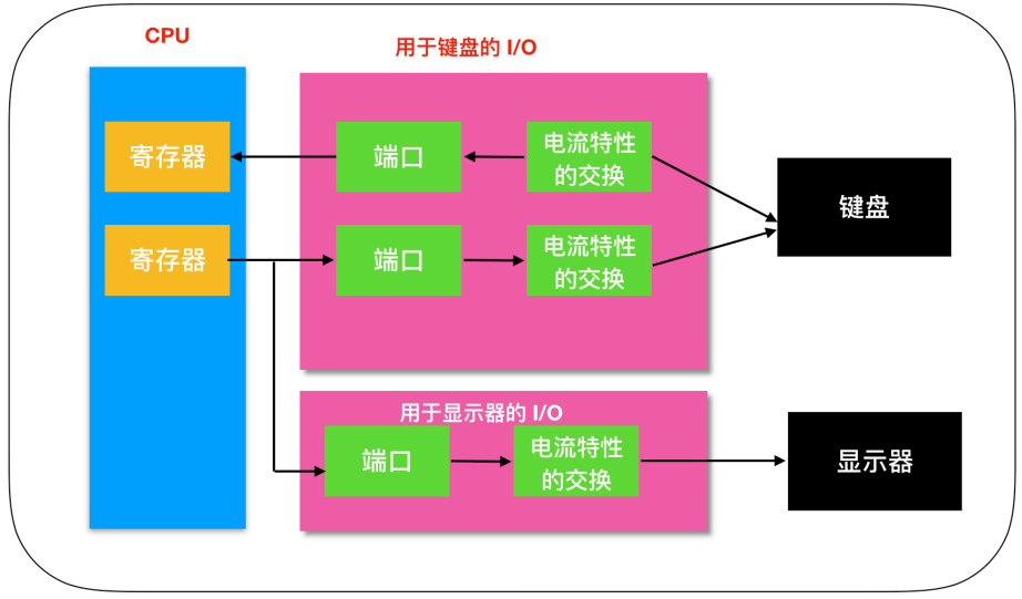 lO是Input/Output 的缩写。显示器、键盘等外围设备都有各自专用的 I/O控制器。I/O控制器中有用于临时保存输入输出数据的内存。这个内存就是端口(port)。端口你就可以把它理解为我们上述说的 港口。IO控制器内部的内存,也被称为 寄存器,不要慌,这个寄存器和内存中的寄存器不一样。CPU内存的寄存器是用于进行数据运算处理的,而IO中的寄存器是用于临时存储数据的。