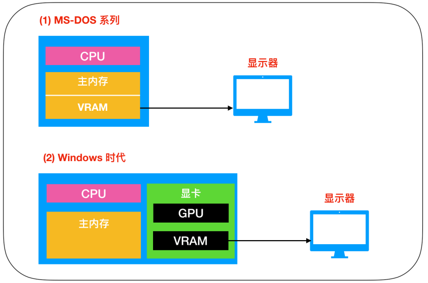在 MS-DOS 时代,对于大部分计算机来说,VRAM都是主内存的一部分。在现代计算机中,显卡 等专用硬件中一般都配置有与主内存相独立的VRAM和GPU(Graphics Processing Unit),也叫做图形处理器或者图形芯片。这是因为,对经常描绘图形的windows来说,数百兆的VRAM都是必需的。