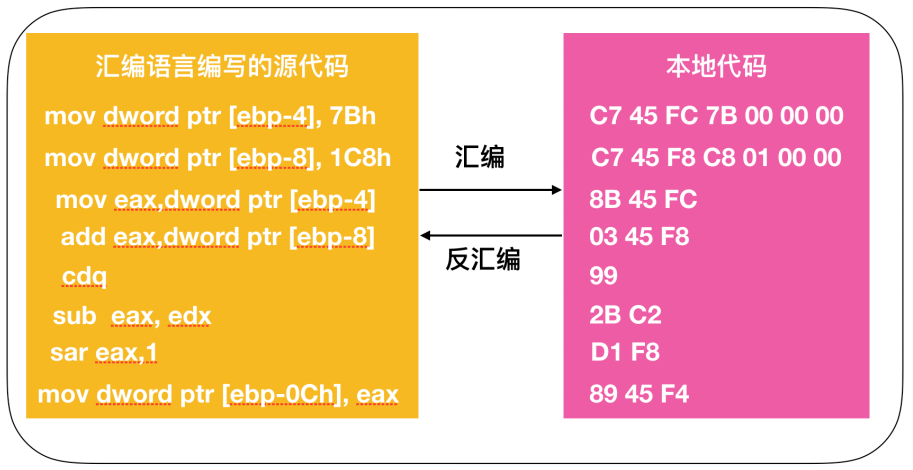 这是采用汇编语言(assembly)编写程序的一部分。汇编语言采用 助记符(memonic)来编写程序,每一个原本是电信号的机器语言指令会有一个与其对应的助记符,例如 mov,odd 分别是数据的存储(move)和相加(addition)的简写。汇编语言和机器语言是——对应的。这一点和高级语言有很大的不同,通常我们将汇编语言编写的程序转换为机器语言的过程称为 汇编 ;反之,机器语言转化为汇编语言的过程称为 反汇编。