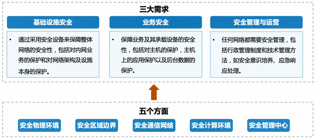 企业网络安全需求大致分为三部分,但是在设计对应的网络安全技术方案时,通常根据企业结构划分网络,从五个方面制定方案。