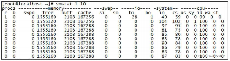 在图中,我们在执行vmstat的时候,后面加了两个参数,其中参数1代表每隔1秒获取一次服务器的资源使用数据,10代表总共获取10次。