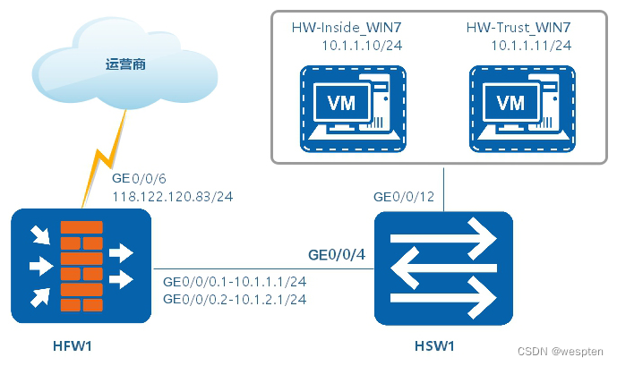 第1步,配置HFW1防火墙,虚拟机HW-Inside_WIN7、HW-Trust_WIN7无须认证就可以访问互联网。