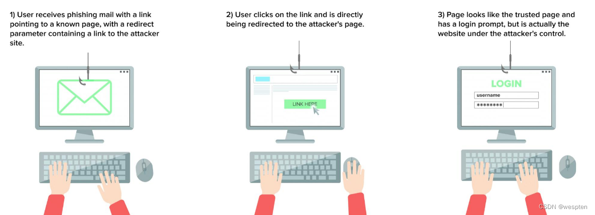 开放重定向(CWE-601: URL Redirection to Untrusted Site),也叫URL跳转漏洞,是指服务端未对传入的跳转url变量进行检查和控制,导致诱导用户跳转到恶意钓鱼网站,由于是从可信的站点跳转出去的,用户会比较信任。