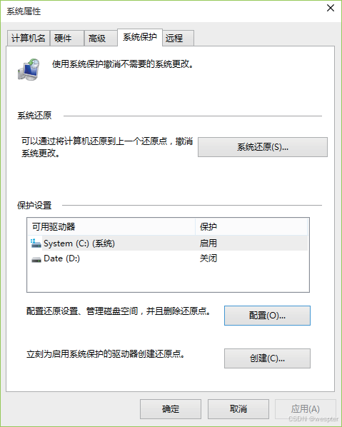 系统保护与系统还原基于 NTFS 文件系统的卷影复制实现其功能。默认情况下安装完成 Windows 10 之后,操作系统会自动启用针对 Windows 分区的系统保护功能。