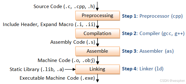 上述gcc命令其实依次执行了四步操作:1.预处理(Preprocessing), 2.编译(Compilation), 3.汇编(Assemble), 4.链接(Linking)。