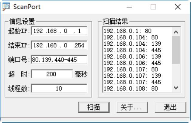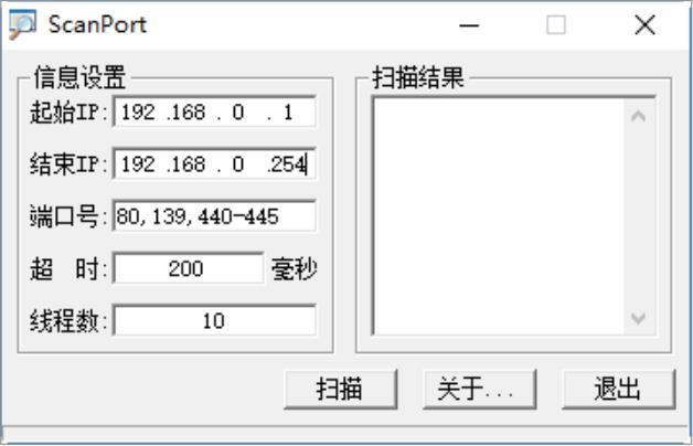 Step01 下载并运行 ScanPort 程序,打开 ScanPort 主窗口,在其中设置起始 IP 地址、结束 IP 地址以及要扫描的端口号,如图所示。