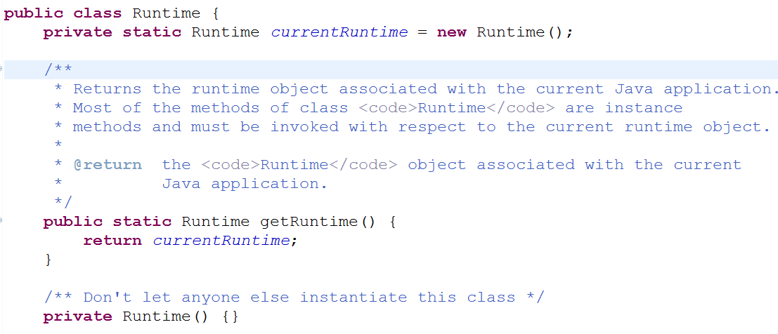 由上面源码可以看到,构造器私有化了,即外部我们不能 new 一个新的 Runtime 实例,而内部给了我们一个获取 Runtime 实例的方法 getRuntime() 。