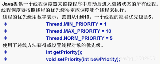 具有较高优先级的线程对程序更重要,并且应该在低优先级的线程之前分配处理器资源。但是,线程优先级不能保证线程执行的顺序,而且非常依赖于平台。