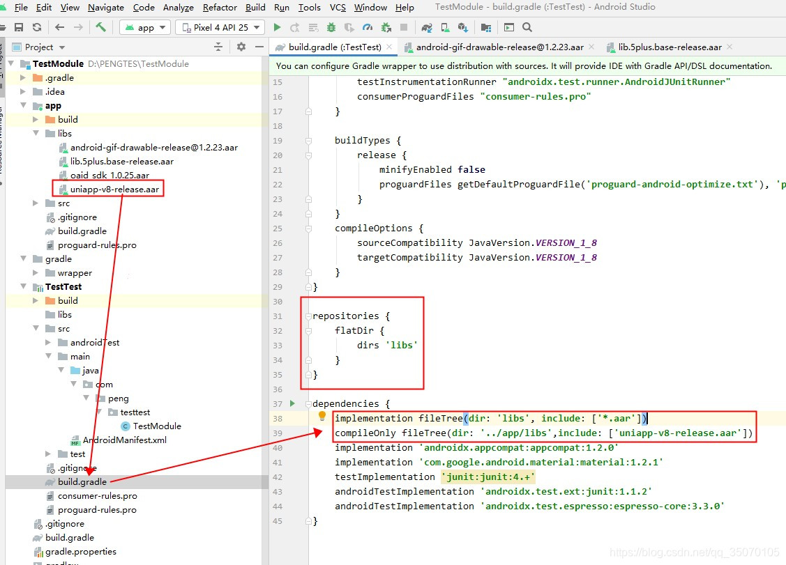 第四步:配置module下的build.gradle,引入uniapp-v8-release.aar
