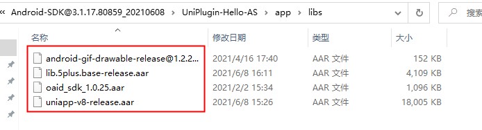 第二步:新建Android项目,解析下载下来的SDK包,将 UniPlugin-Hello-AS 下的 libs包下的四个aar文件拷贝到自己的项目libs包下