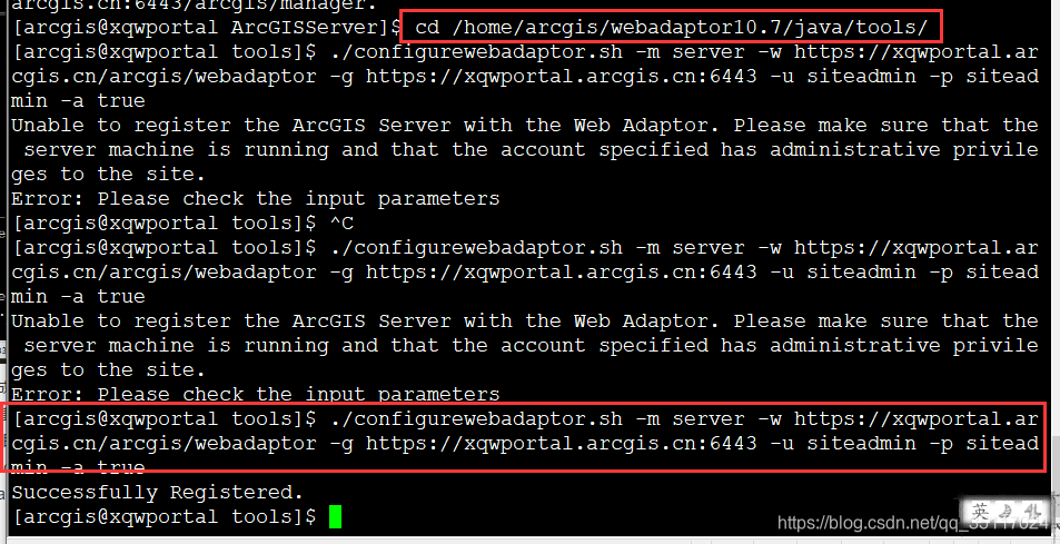 站点创建完成后,我们使用命令“cd /home/arcgis/webadaptor10.7/java/tools/”进入到webadaptor目录,然后使用“./configurewebadaptor.sh -m server -w https://xqwportal.arcgis.cn/arcgis/webadaptor -g https://xqwportal.arcgis.cn:6443 -u siteadmin -p siteadmin -a true”命令来注册server,如图: