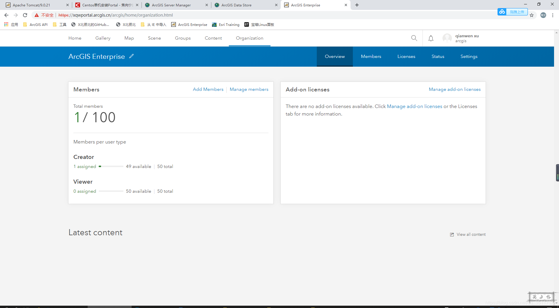 安装完成后,在浏览器通过地址“https://xqwportal.arcgis.cn:7443/arcgis/home”来进行授权和创建账户,如图: