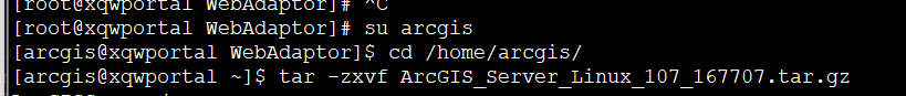 将webadaptor10.7安装包拷贝至/home/arcgis目录下,然后切换回arcgis用户,使用命令“tar -zxvf WebAdaptor***”解压后进入到解压后的文件夹。