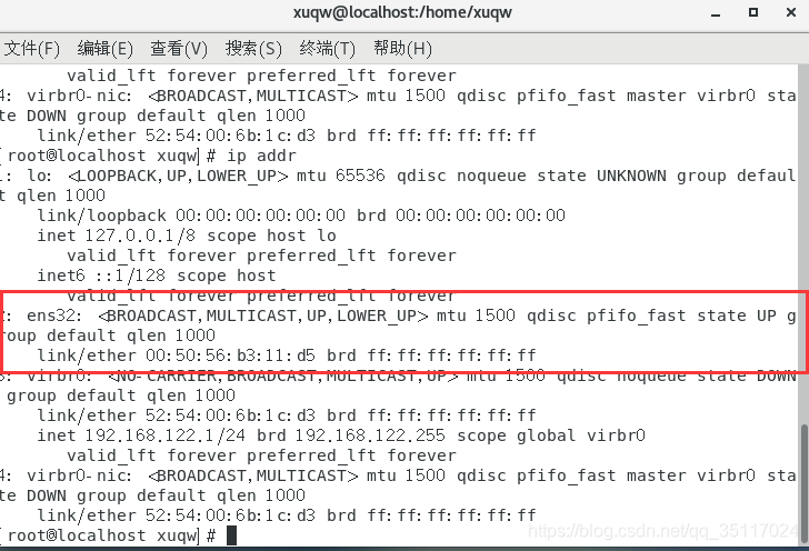 附:如果它有ip配置信息的话,会在ens32这样的字眼后面有一个“inet”的值,上图中没有inet,所以推断新装的系统是没有启动网卡的,我们需要将它的网卡启动。