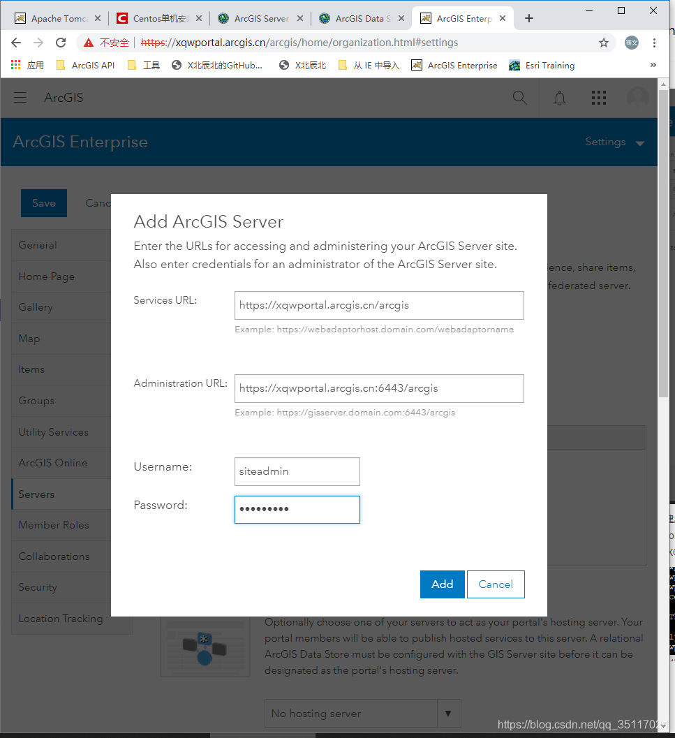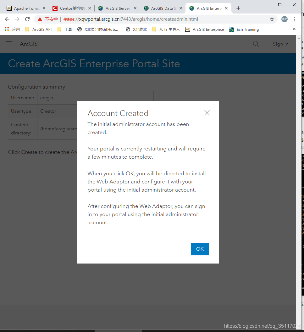 安装完成后,在浏览器打开“https://xqwportal.arcgis.cn:6443/arcgis/manager”地址来创建站点。
