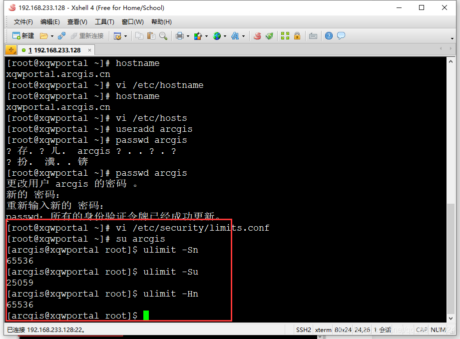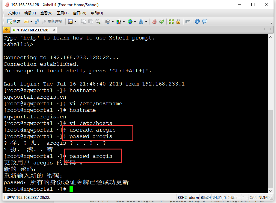 使用命令“useradd arcgis”和“passwd arcgis”来添加arcgis用户和设置密码,如图: