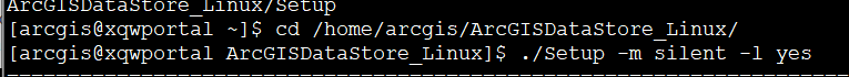 将DataStore安装包拷贝至服务器,目录跟上述两文件目录相同,然后切换回arcgis用户,解压,导航至解压后的路径,使用命令“./Setup -m silent -l yes”进行安装,如图: