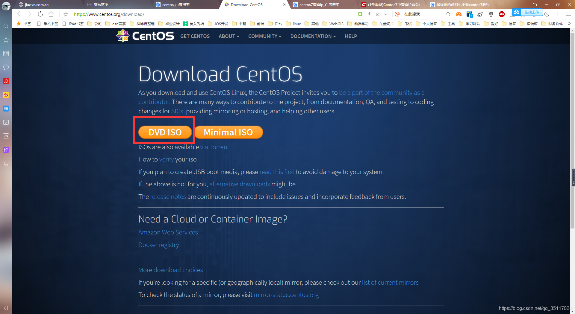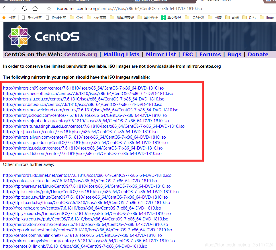 在centos官网下载centos7.6的安装包,以下链接随意挑选一个下载即可(安装包镜像大概4G左右),如图: