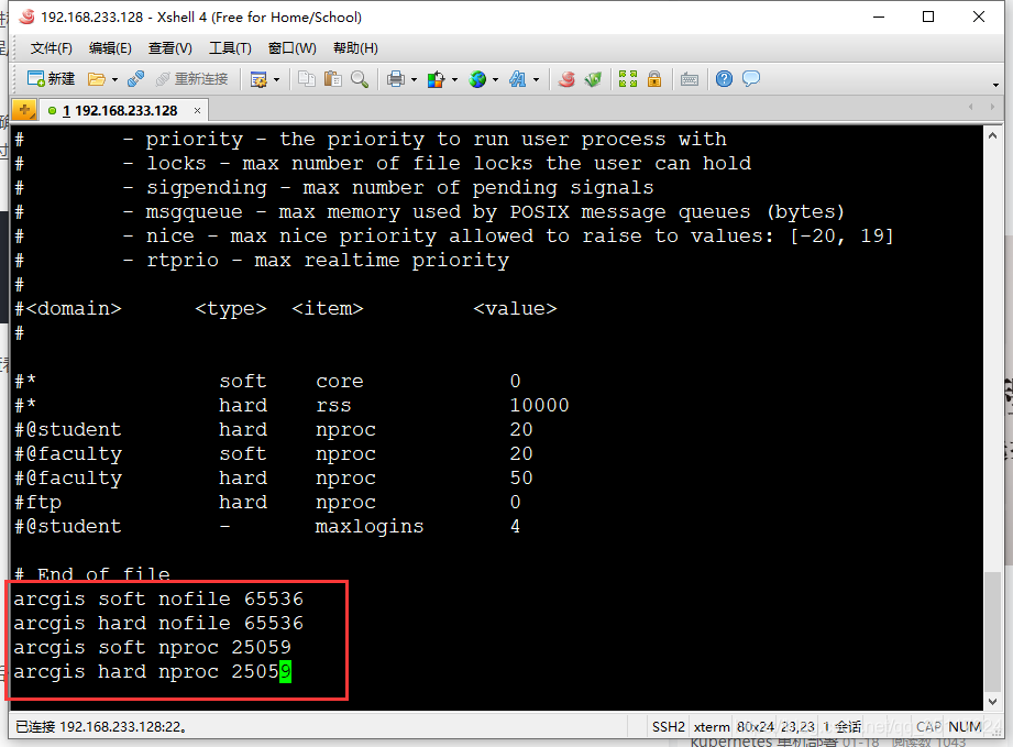 使用命令“vi /etc/security/limits.conf”来修改文件句柄,在limits.conf文件末尾添加如下信息,如图: