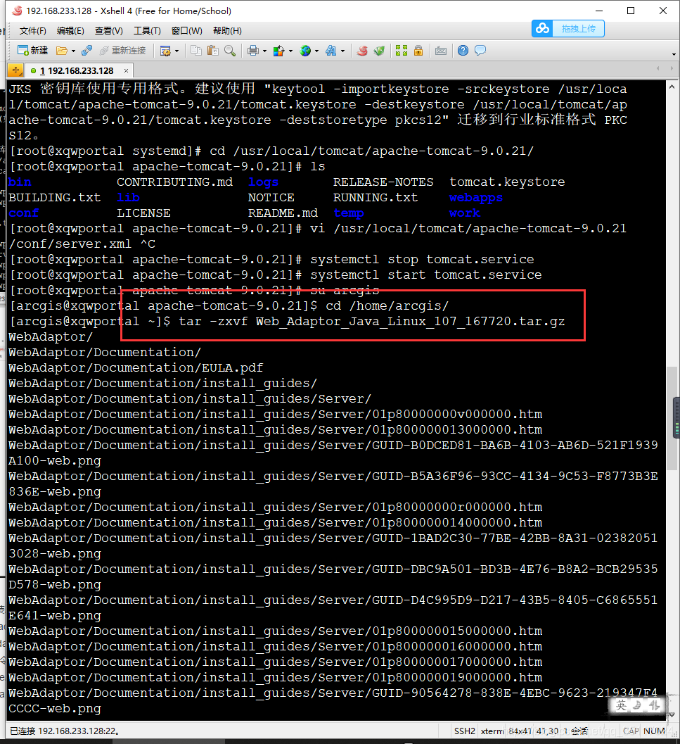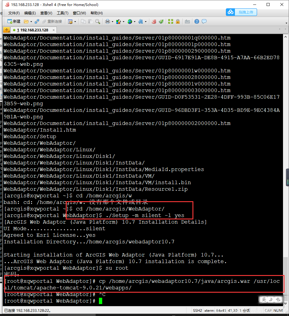 使用命令“ ./Setup -m silent -l yes”来安装webadaptor,安装完成后切换回root用户,使用命令“cp /home/arcgis/webadaptor10.7/java/arcgis.war /usr/local/tomcat/apache-tomcat-9.0.21/webapps/”将arcgis.war包拷贝至tomcat中,如图: