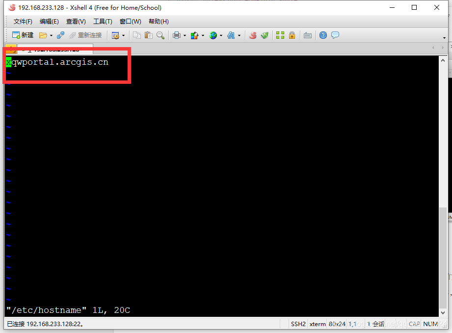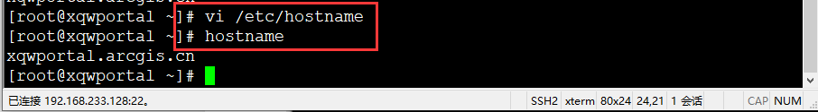 通过上述操作后我们启动了网卡,并查看到服务器的ip信息,接下来我们打开XShell,连接服务器之后通过“vi /etc/hostname”命令来修改主机名称,然后保存退出,重启服务器,之后通过“hostname”来测试,如下: