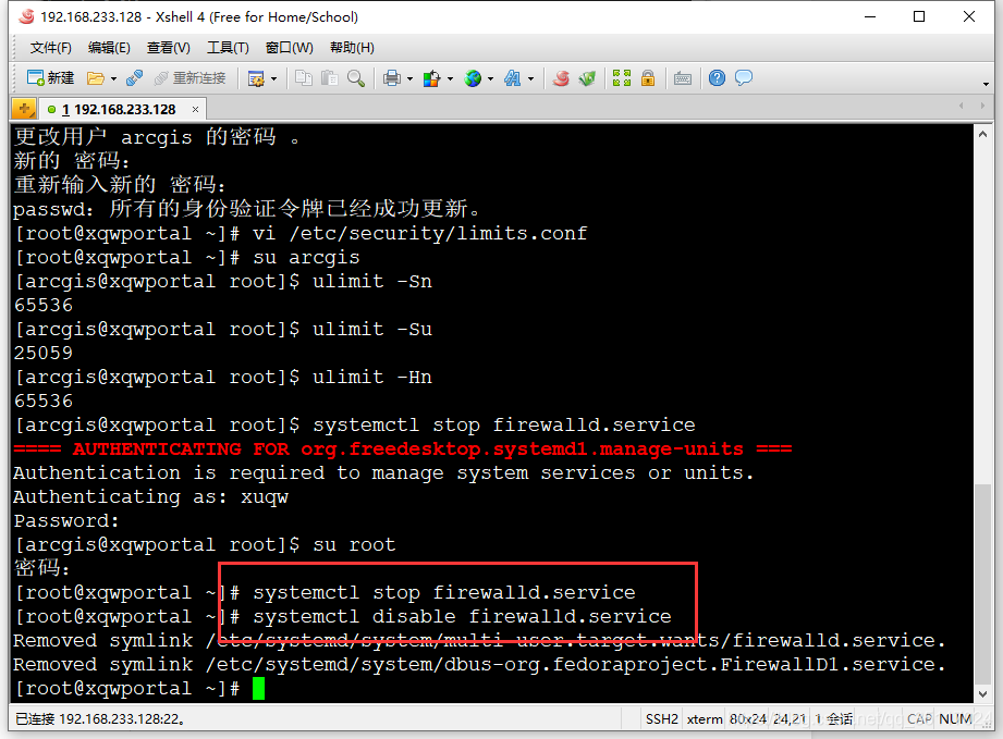 使用命令“systemctl stop firewalld”和“systemctl disable firewalld”来关闭防火墙和禁止防火墙开机启动,如下: