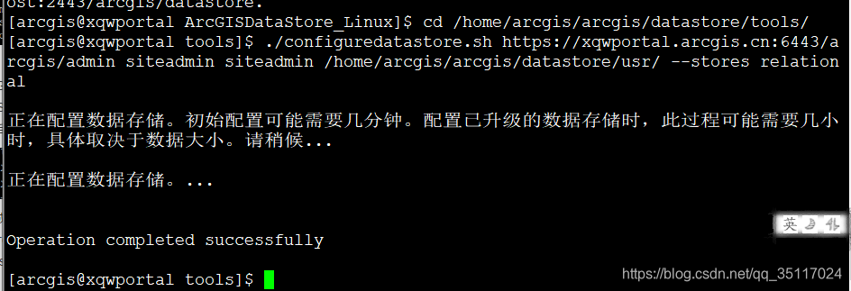 安装完成后,导航至“/home/arcgis/arcgis/datastore/tools/”目录,然后使用“./configuredatastore.sh https://xqwportal.arcgis.cn:6443/arcgis/admin siteadmin siteadmin /home/arcgis/arcgis/datastore/usr/ --stores relational”命令来注册关系型数据存储,如图: