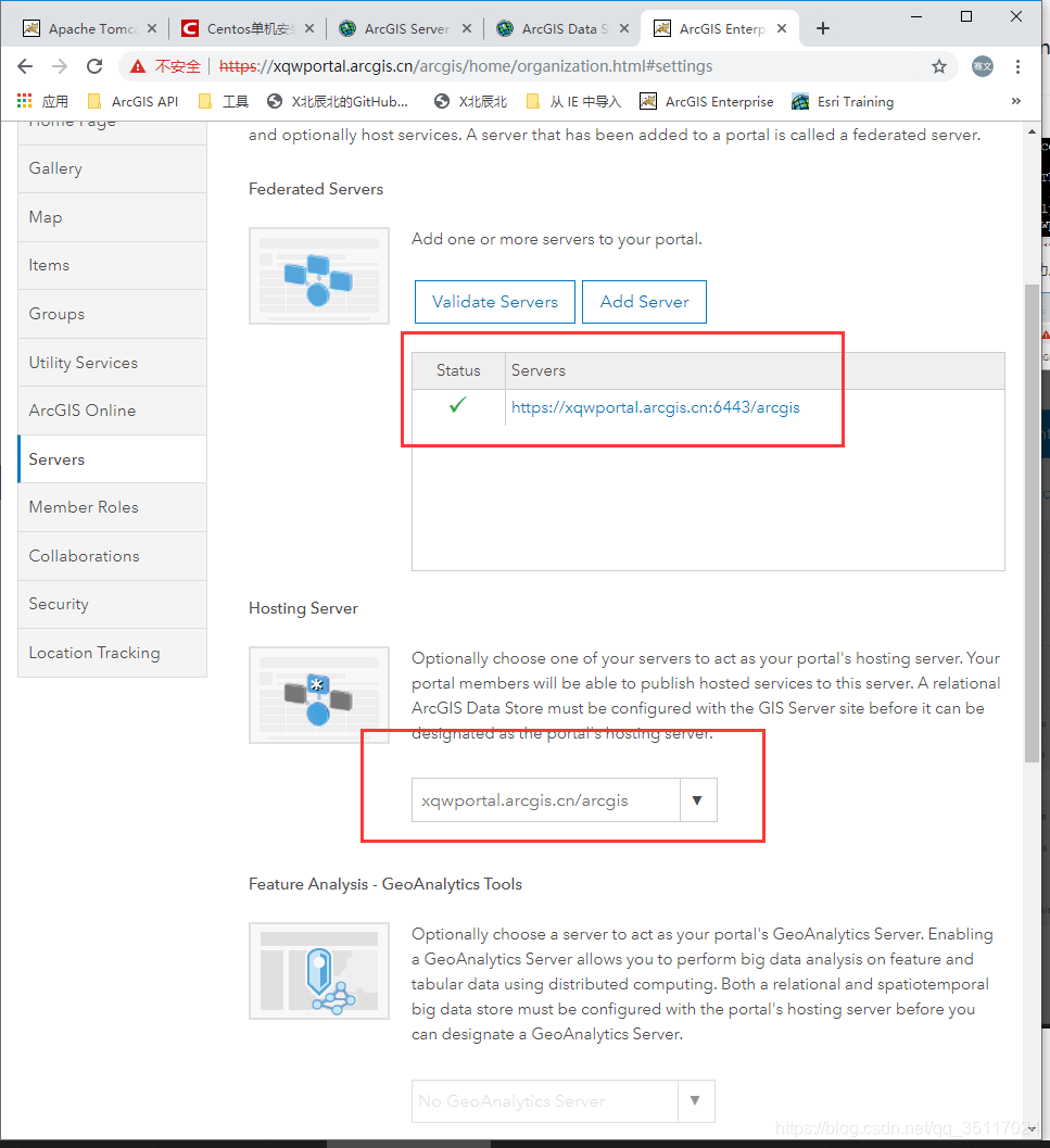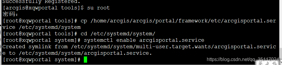 server托管成功后,切换回root用户,使用命令“cp /home/arcgis/arcgis/portal/framework/etc/arcgisportal.service /etc/systemd/system”将portal.service服务拷贝至系统开机自启动服务列表,然后通过命令“systemctl enable arcgisportal.service”设置开机自启动,如图: