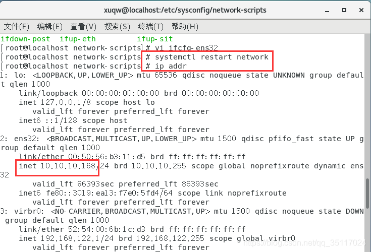 如上图所示,将ONBOOT的值设置为yes,然后保存退出。使用命令“systemctl restart network”来重启网卡,再次查看ip发现,此时我们可以看到服务器的ip信息了,如下:
