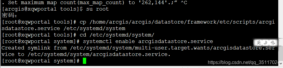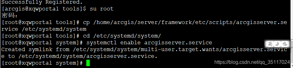 server注册完成之后,切换回root用户,使用命令“cp /home/arcgis/server/framework/etc/scripts/arcgisserver.service /etc/systemd/system”将server服务拷贝至系统服务目录,然后导航至/etc/systemd/system/目录下,使用命令“systemctl enable arcgisserver.service”添加server开机自启动,如图: