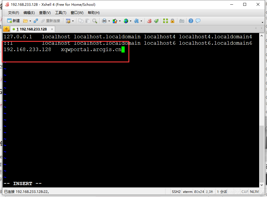 使用命令“vi /etc/hosts”命令编辑hosts文件,添加服务器本机的ip和域名信息,如下: